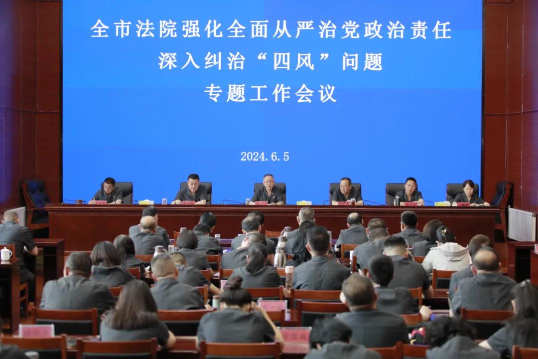 6月5日上午,吕梁市中级人民法院召开全市法院强化全面从严治党政治责任 深入纠治“四风”问题专题工作会议。市中院党组书记、院长刘勇飞讲话,市中院党组成员、政治部主任袁子捷主持。市中院领导班子成员、各部门正副职干部及各基层法院院长、主持日常工作的副院长、派驻纪检监察组组长参加会议。