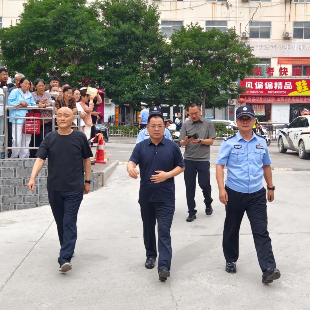 杜侯平一行在石楼中学考点,详细查看考点周边治安巡逻、交通管控、应急处置等工作。在考点入口处,杜侯平书记仔细询问警力部署、安检流程及周边隐患排查情况,与执勤民警亲切交流,对公安部门提前谋划、周密组织的安保工作给予肯定,并指出要以“时时放心不下”的责任感筑牢安全防线。