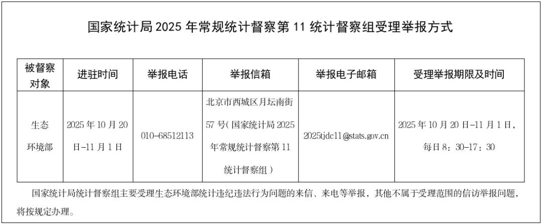 根据党中央和国务院授权,国家统计局2025年常规统计督察第11统计督察组近日进驻生态环境部开展统计督察,并于10月20日与生态环境部进行对接沟通。督察组组长、国家统计局党组成员、副局长毛盛勇通报统计督察事宜,提出工作要求。生态环境部党组成员、副部长李高参加对接沟通并讲话。
